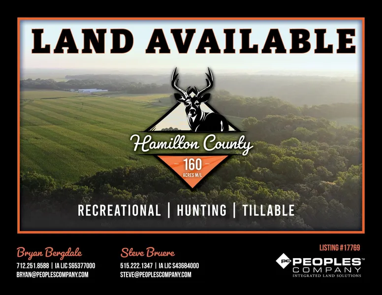 Peoples Company is pleased to present an exceptional farm located just north of Stratford in Hamilton County, Iowa. The farm consists of 160 acres m/l with 104.20 tillable acres m/l boasting a CSR2 rating of 82.8. Primary soil types include Luther loam and Webster clay loam. The high-quality tillable acres are surrounded by thick mature timber, making this property a hunters paradise, perfect for growing and holding large deer. The eastern road frontage allows for easy access to every part of the property without spooking wildlife due to predominantly westerly winds. Despite its secluded location, this property is just 20 minutes south of Webster City and an hour north of the Des Moines Metro. The farm is situated along Big Bear Road in Section 17 of Webster Township in Hamilton County, Iowa.