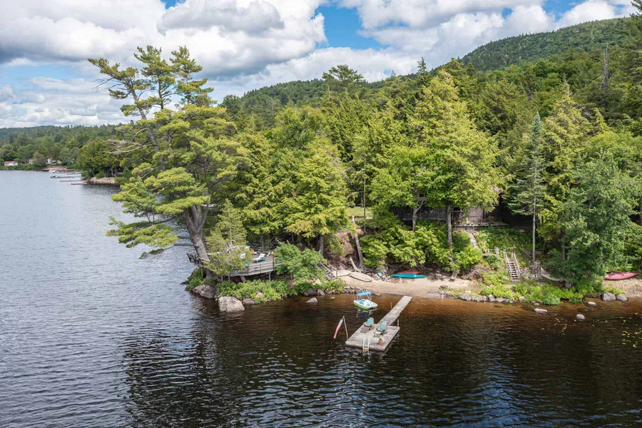 Owls Head Camp, Long Lake. On a private elevated peninsula overlooking Long Lake, Owls Head Camp offers 5 bedrooms, 2.5 baths , spacious screened porches on the eastern Long Lake shoreline.The unique location provides views across the lake to Owls Head Mt. and evening sunsets. The original Craftsman style camp has recent renovations that included a modern kitchen plus 3 bedrooms & bath upstairs.The large open living and dining area overlooks the lake. A peninsula point deck gives panoramic views of the lake. A sandy beach area connects to a swimming dock. A very nice guest apartment is part of the large barn/garage building. The apartment is in use as short term rental. Owls Head Camp, a rare and special Long Lake property.