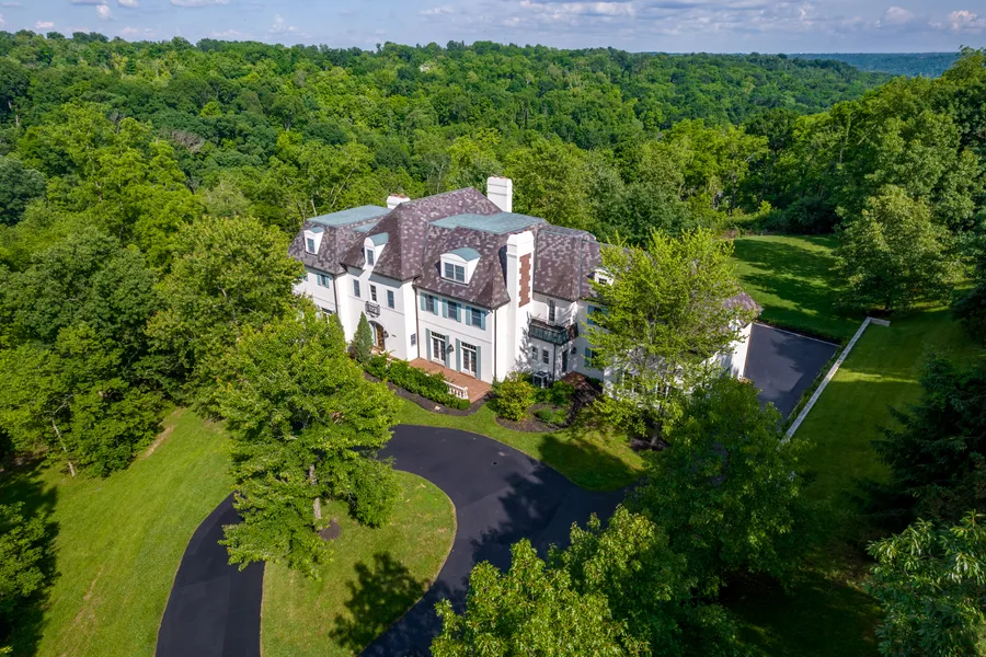 Beautiful French Provincial styled home on three acres, adjacent to the 13-acre Rowe Arboretum Nature Preserve, with direct access into the park. Exceptionally well built by Jack Brand, the construction includes Vermont slate, cement siding, copper gutters, custom-designed wrought iron, French limestone, imported Jura Limestone and Kentucky oak hardwood parquet flooring, seven wood-burning fireplaces, and dramatic beamed ceilings. Lovely herringbone-patterned brick patios and a screened porch overlook a level rear yard and valley views. Finished lower level adds over 1200 square feet of usable space. Exceptional in every way!
