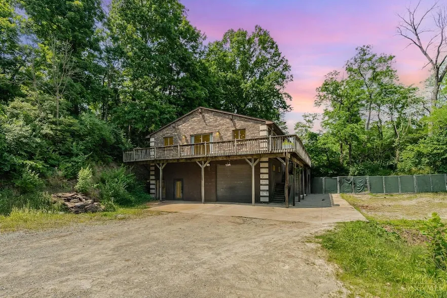 Private, gated retreat on 3.44 acres with a pond, massive garage, and over 2,400 sq ft of living space! This 3-bed, 3-bath home sits on two parcels and backs up to I-74 ideal for home-based business or hobby use. Inside, enjoy a bold custom kitchen with stainless counters, floating table, double ovens, and gas cooktop. Two oversized living areas include a cozy family room with wood-burning stove. The spacious primary suite features a walk-in closet and private bath. A dedicated office, laundry, and half bath complete the functional layout. Outside, unwind on the covered porch or entertain on the huge deck. The 2,000+ sq ft garage and block outbuilding offer exceptional space for auto work, storage, or creative ventures. Fully fenced with gated entry, mature trees, and private pond views. Located in Three Rivers SD just minutes to downtown Cleves and Cincinnati.