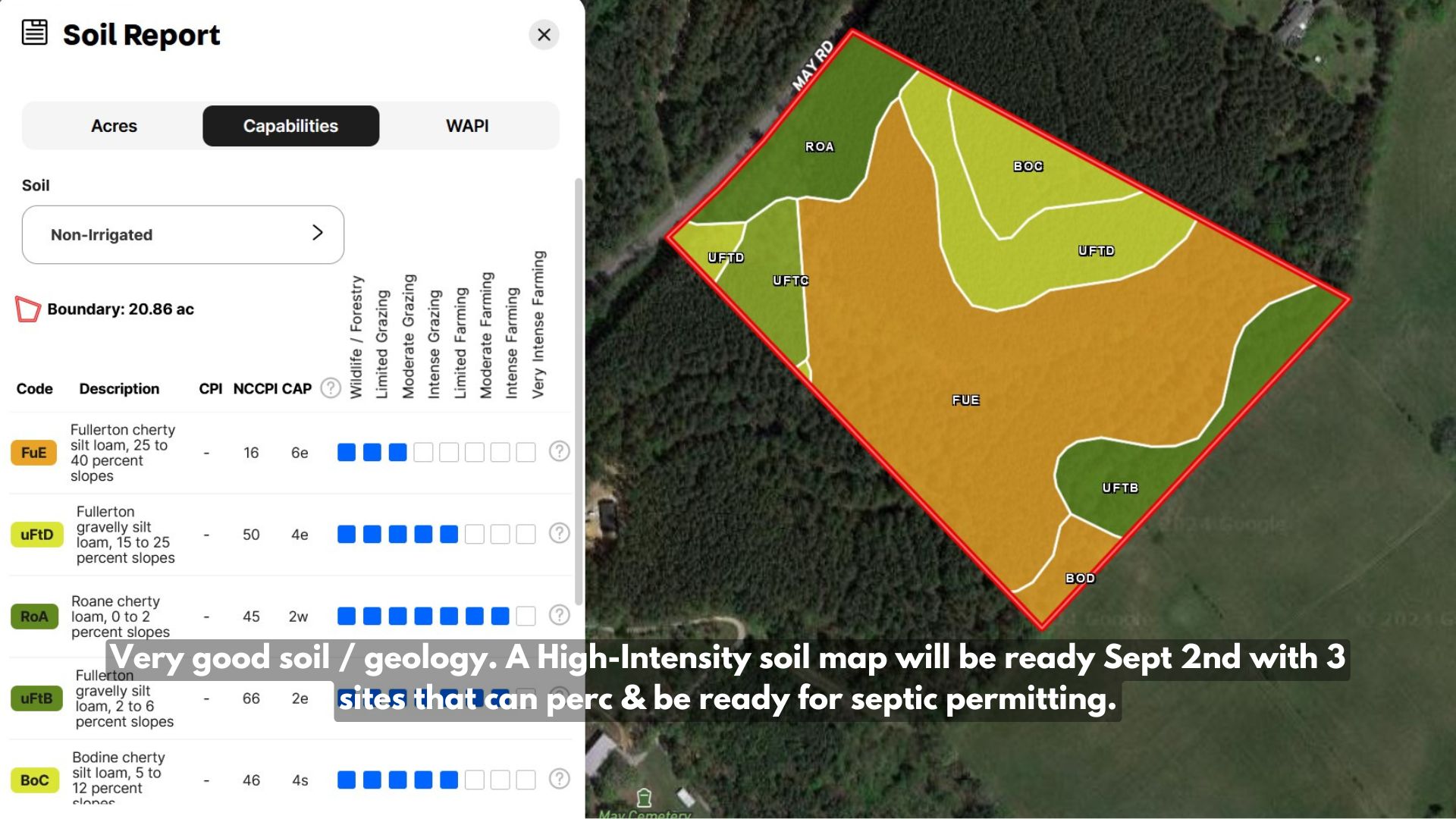 Our High-Intensity Soil Map for the property is currently being drawn and will be ready 1st week of September. The High-Intensity Soil Map is the report that you attach as a backup to your septic application (also called an Ossf or On-Site-Sewage-Facility application). It is a drawing on your survey or plat that classifies the slopeage, soil type, and percability of a given spot where your septic drain field would be installed. The idea here is to give the homeowner a recommendation on where to place the drain field, so that their system and homesite can be located accordingly.