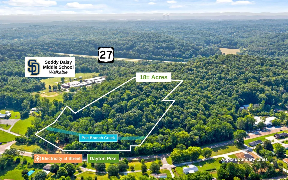 18+ acres in an extremely convenient location: 2 minutes to Hwy 27, across from the US Post Office, and walkable to Soddy Daisy Middle School. Seeking land near town? This parcel could be the site to build your Tennessee hilltop estate, surrounded by mature trees, with expansive views of the valley. Gated, creek, views of Mowbray Mountain, rolling topography with lightly cleared timber. Property also has the makings of a future development site with appx. 395 feet of Dayton Pike frontage, multiple zoning options, and utilities at the street. LOCATION: 2 minutes to Hwy 27, 6 minutes to Wal-Mart and multiple restaurant options, 10 minutes to Hwy 153 and 23 minutes to downtown Chattanooga. * Please contact WWTA for sewer connectivity. * Property owner just combined Parcel IDs, public records may not be updated. * Property is currently enrolled in the Greenbelt. Should Purchaser choose to remove the property from the Greenbelt, Purchaser to be responsible for the payment of any rollback taxes.* (Any and all property lines on photos are simulated and are approximate. Buyers to verify acreage, restrictions, property corners, property lines and all matters deemed important to purchaser.)