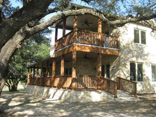 EVERYTHING THE OUTDOORSMAN WOULD WANT PLUS LUXURIOUS LIVING: Beautiful 2 story stone lodge/home nestled in oak trees on 260 acres with fantastic views! The approximately 5500sf under roof consists of 4 bedroom suites/ 2 with balconies, large game room with large bath, large dining/conference room, open den with 20' ceiling and massive stone fireplace, gourmet kitchen and pantry,laundry room, powder room, wine room with climate control, hickory wood floors, outdoor kitchen and fireplace, large cedar deck overlooking a 10 acre spring fed managed lake stocked with bass, catfish and perch, 5 RV hook-ups with amenities, stone fire pit and a 20'X 20' lighted Heli pad.
