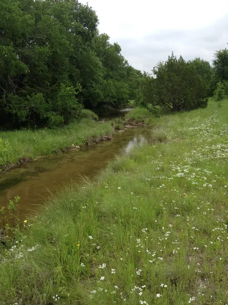 The terrain is rolling, with nice trees near the creeks and scattered trees across the back of the ranch. The two creeks cross near the center of the property, with a possible area for a much larger pond or small lake. The big creek currently has some water holes.
