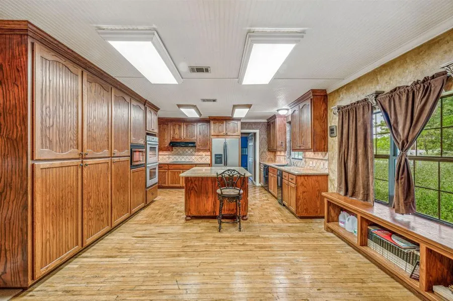 This spacious 4100 square foot home, added on to and remodeled in 2006, features 5 bedrooms, 5 full baths, and a layout perfect for entertaining. The kitchen boasts a breakfast nook, while the large living room opens up to a dining room and bonus room. The primary bedroom downstairs has his and hers bathrooms, while two spare bedrooms also have their own full baths. Upstairs, a sitting room with an entertainment center and wet bar leads to two split bedrooms with walk-in closets and full baths. The house offers ample storage with cabinets and walk-in closets throughout, as well as multiple bonus rooms. Outside, a two-car detached garage and large barn with electricity and insulation provide storage and work space. Additional features include a smaller barn and chicken coop. Perfect for those looking for space and versatility in a home!