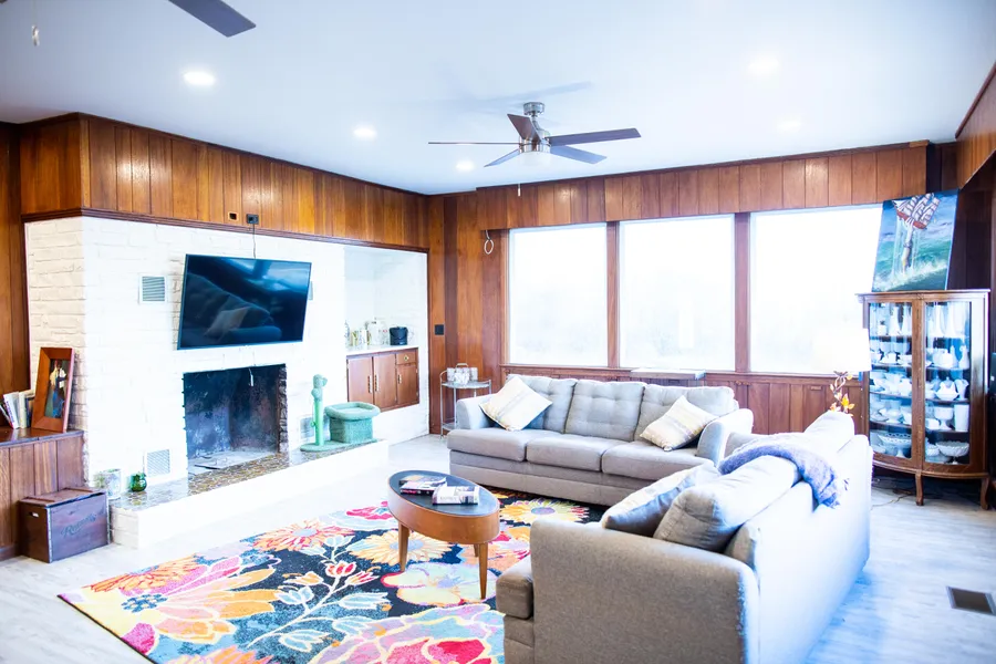 This beautiful Mid-Century Modern home consists of 3 bedrooms, 2.5 baths sprawling across 2630 sq ft of living space. The home was completely renovated in 2018 including new windows, new plumbing, new electrical and fixtures, new kitchen & all baths, flooring, roof & HVAC. The home features an amazing sunken den with fireplace and wet bar. It is extremely spacious, and feels as if you are out on larger acreage because it backs up to a nice wooded area. The dining area is also extremely large, and has a built in area with cabinets. The kitchen was updated with wood cabinets, quartz countertops & stainless steel appliances. The bedrooms are all good size with nice closets. The master bathroom has a large, subway tile walk in shower, and the hall bath has a whirlpool tub with tile surround. Come take a look, this one won't last long!