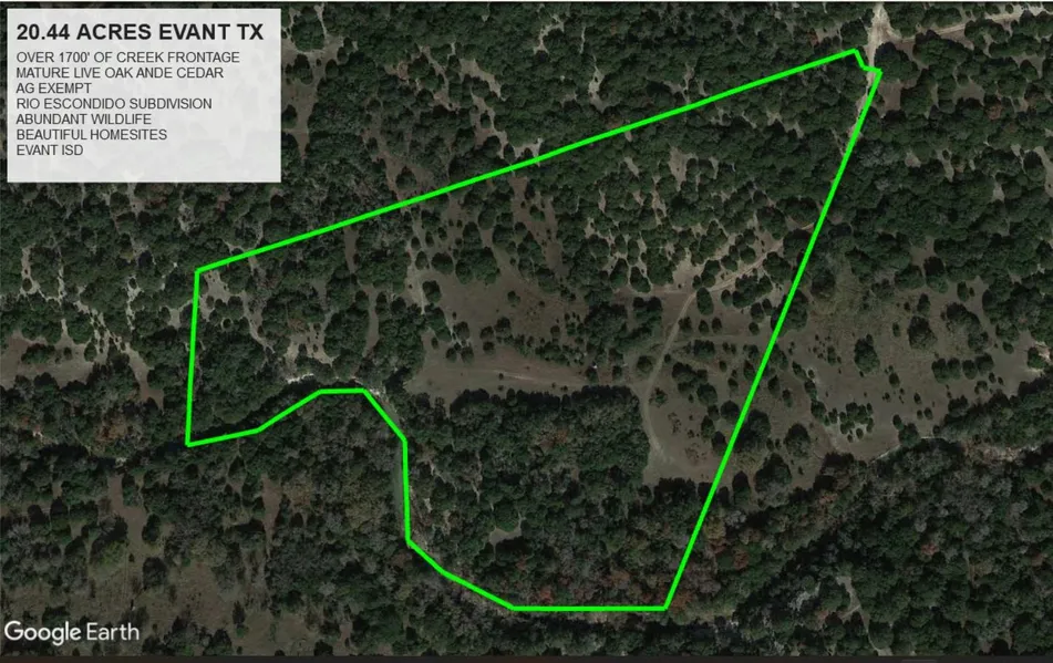 MOTIVATED SELLER! A REMARKABLE 20.44 ACRES IN THE RIO ESCONDIDO SUBDIVISION JUST OUTSIDE EVANT TEXAS. WITH OVER 1700' OF PRISTINE CREEK FRONTAGE AND BEAUTIFUL SCENIC HOMESITES, IT WILL BE EASY TO FIND THE PEACE AND QUIET YOU'VE BEEN LOOKING FOR. THIS PROPERTY LIES IN A CUL DE SAC AT THE END OF A YET UNNAMED ROAD. LAND GENTLEY SLOPES DOWN TO A TRANQUIL CREEK BOTTOM WHERE FOSSILS AND ARROWHEADS CAN BE FOUND. WHITETAIL DEER AND OTHER WILDLIFE ARE ABUNDANT. IT'S A PLACE THAT MAKES FEELS LIKE A VACATION FROM THE REST OF THE WORLD. JUST AN HOUR AND A HALF AWAY FROM AUSTIN AND AN HOUR TO WACO. AG EXEMPTION IN PLACE. ELECTRIC AND HIGH SPEED INTERNET SERVICE PLANNED TO BE IN PLACE IN DECEMBER. EVANT ISD. LOTS 13 & 14.