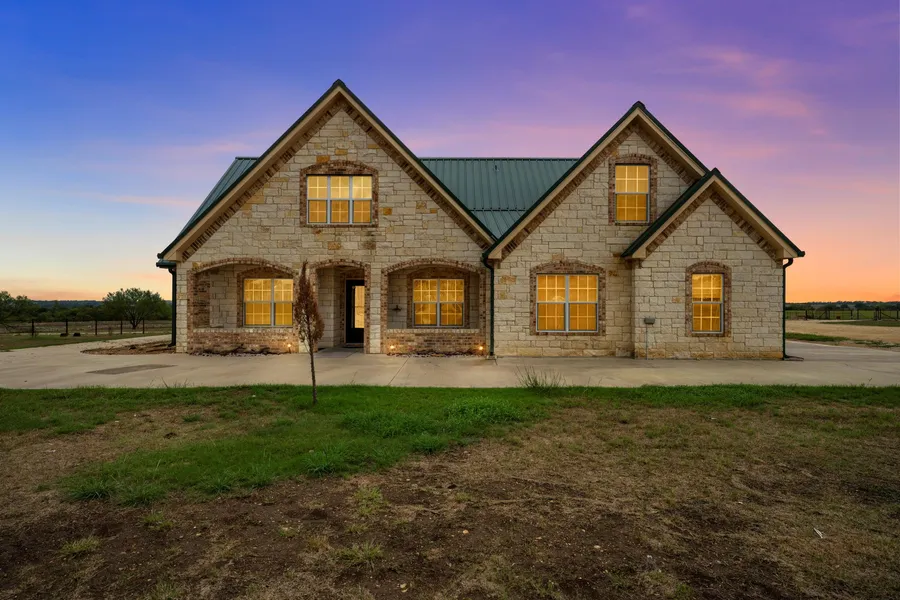 This is a beautiful 2 story rock with brick home with a metal roof that was custom built in 2013. It is a 4 bedroom to 3 bath 2 car garage home. The AC unit is equipped with 4 zones for the comfort of everyone. Upstairs is a bedroom and bath with a large setting area or play area. There is an electric stair climber as well for the upstairs. Downstairs as you walk into the foyer and you have an open dining and living room. The living room has approx. 16 ft ceilings with a fireplace. Currently the fireplace has electric logs but can easily be converted back to wood. There has never been a fire built in the fireplace. The kitchen area has two pantries and a breakfast eating area that looks out over the ponds. The master bedroom and bath has handicap accessible doors. There is a door in the master bedroom that leads out to an enclosed porch that overlooks the ponds. This is a split floor plan with the other two bedrooms and bath on the other side of the home.