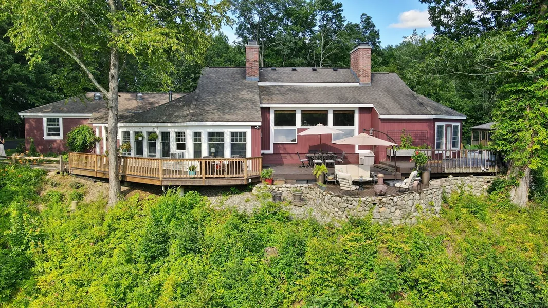 Introducing ''Brookside'', a California-style Chalet situated on a bluff overlooking miles of meadows, mountains and waterways. Enjoy hiking, fishing, swimming, and country life -yet only 25 min. from Hartford/Westfield. Expansive terraces, inground heated pool and gazebo. Designed in 1942 by notable architect Sherwood Jeter for Frank Wolcott who modeled the property after his historically significant West Hartford property with design elements such as arched doors, wood ceilings, beams and locally-quarried brownstone fireplaces. An extraordinary primary suite on the southern wing. 3 more bedrooms, bonus spaces and 2 baths on the northern wing. The Great room is flanked by two fireplaces leading into the remarkable cook's kitchen. 3 car gar. Recently extensively renovated and expanded.