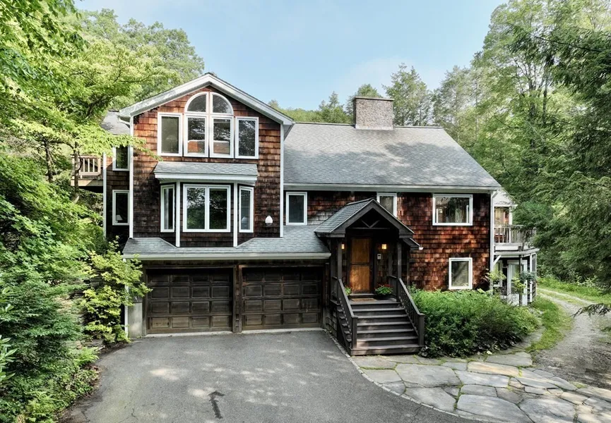 This wonderfully unique property has been refreshed and is ready to go! Set far back from the road, there is a 4 bdrm house with ground floor apartment, a covered stair leading to a two story hillside studio/guest house, and not far from the main house, what has aptly been described as the most beautiful little barn/workshop in New England. The retreatlike compound is set on 4+ very private acres surrounded by conserved land and hiking trails, conveniently located just outside Williamsburg's village center and 15 mins from the cultural hub of Northampton. Serenity, simplicity and a connection to nature gives it a Zenlike vibe that must be felt to be appreciated! Highlights: A generous home office with beautiful maple and cherry built-ins, 2 primary bedrooms sharing a spalike bath, multiple decks and balconys, mature landscaping including huge rhododendrons and Goshen stonework, and a stu...