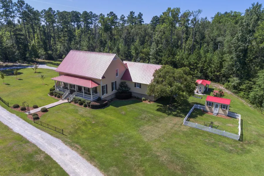 Prepare to be ''Wowed'' as you drive through the gated entryway of this breathtaking, 10+ Acre property! This spacious Lowcountry-style home, with red metal roof and beautiful open foyer, will make you feel instantly welcomed. Relax on the large front porch or screened back porch...perfect for sipping sweet tea and enjoying nature, or entertain guests... the open kitchen (with roomy pantry) and large dining and great rooms are perfect for large gatherings! As you walk through this lovely home, take note of the wonderful craftsmanship that is evident throughout! From the 10' high ceilings to antique transom window and lighting accessories, this home is a true gem! Home features 4 spacious bedrooms, 2.5 baths, wood floors, and updated appliances.