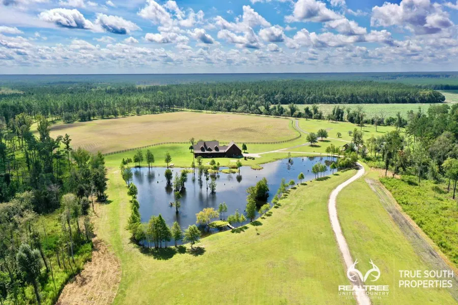 The 4,300 sq. ft. custom log two-story home features cypress woodwork, granite tops, stone fireplace, wood floors, walls, ceilings, and many other unique interior and exterior features. There are 5 bedrooms, 4 full bathrooms, 1 half bath, mud/laundry room, kitchen, pantry, breakfast area and bar, bonus room, formal dining room, foyer, and a living room with high vaulted ceilings overlooked by the 2nd floor balcony featuring a custom wood staircase and large cypress tree trunk support. There's an additional 1,325 sq. ft. heated & cooled three car attached garage, as well as a separate large bonus room above the garage that's multi-functional. There's a large front porch overlooking the 15 +/- acre open pasture, and a large back porch overlooking the backyard fire pit and 3 +/- acre cypress pond stocked with largemouth bass and bream.