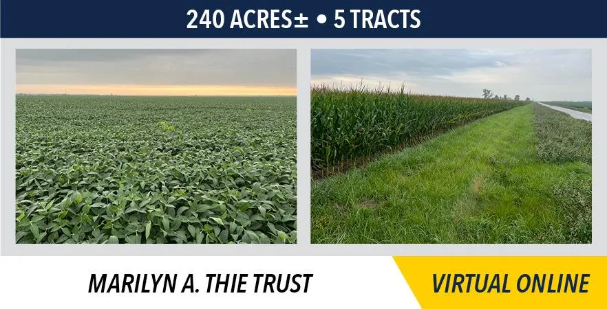 Tracts 1-4 of the Thie farm will be sold on a price per acre basis, based on surveyed acres, and will be offered through the marketing method of Buyers Choice, whereas the high bidder can elect any of the tracts for their high bid. If the high bidder does not elect all offered tracts, then the remaining tract(s) will continue to be offered Buyers Choice until all tracts have been elected. Tract 5 will then be sold for a lump sum total dollar amount. The tracts will NOT be offered in their entirety at the conclusion of the auction.