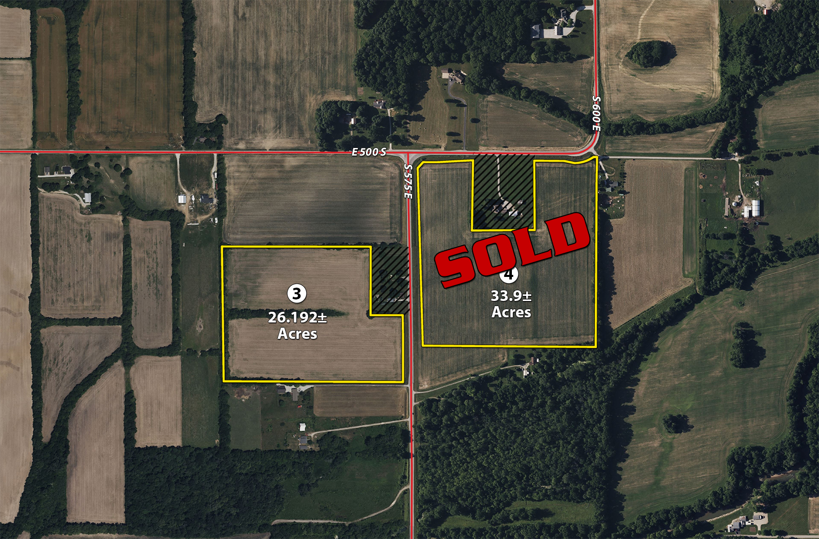 TRACT 4: SOLD 33.9+/-ACRES all cropland. Across road from Tract 3. Great frontage on Co. Rd. East 500S and Co. Rd. South 575E. (List Price - $14,000/acre)