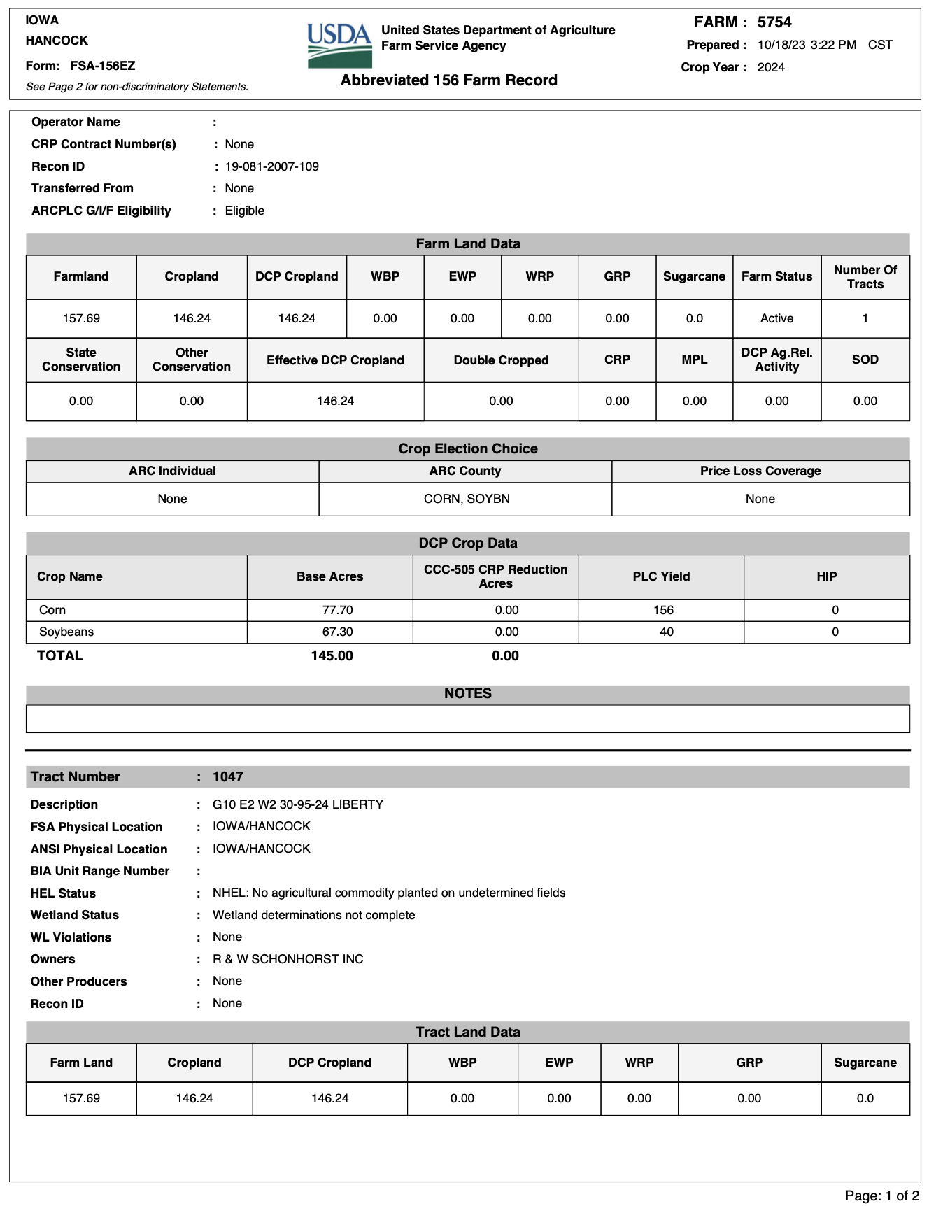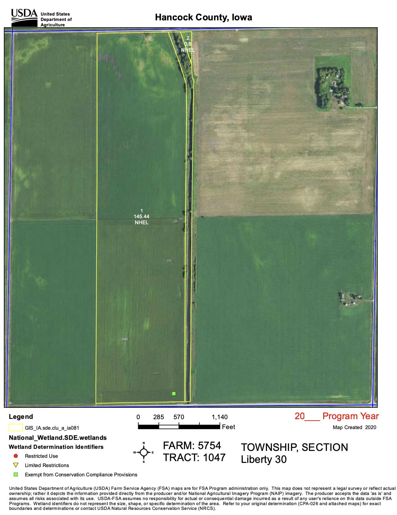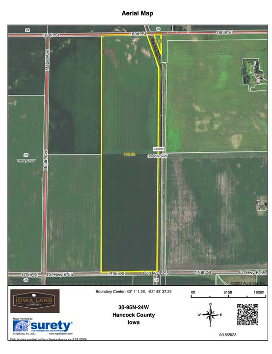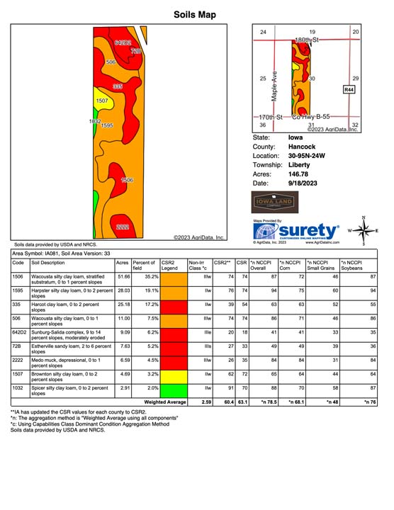 Iowa Land Company is honored to market and present the R&W Schonhorst inc. farmland auction in central Hancock County, Iowa. The farm consists of 147.94 +/- acres, located just 8 miles north of Kanawha, Iowa situated in Section 30 of Liberty Township. The farm will be offered at a public auction on November 28th, 2023 at 1:00PM at the Duncan Community Hall in Duncan, IA. The farm will be offered as a stand alone one tract option. This is a great opportunity for local farmers to expand their current farming operation and give investors the ability to purchase quality farmland acres in the heart of Iowa farm country. The farm consists of 147.94 +/- acres, offering 145 +/- acres considered FSA cropland acres. The CSR2 weighted average is 60.04 with a CSR1 of 63.1. Yield data plays an important role in purchase power, recent yields provide a strong track record for this farm. Mile long rows, yield data, and access to drainage position this farm as an excellent investment. The farm is leased for the 2023 farm season, the 2024 crop year is open for the new buyer.