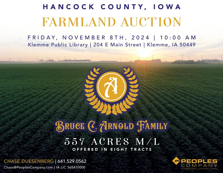 Hancock County, Iowa Land Auction Mark your calendar for Friday, November 8th, 2024! Peoples Company is excited to present a rare opportunity to acquire a large farmland portfolio, owned by the Bruce C. Arnold Family. Hancock County boasts a rich agricultural heritage, and many of these parcels have earned the esteemed "Century Farm" designation, with origins tracing back to 1888. The auction will consist of 557 acres m/l to be sold in eight individual tracts on Friday, November 8th, 2024 at the Klemme Public Library in Klemme, Iowa.