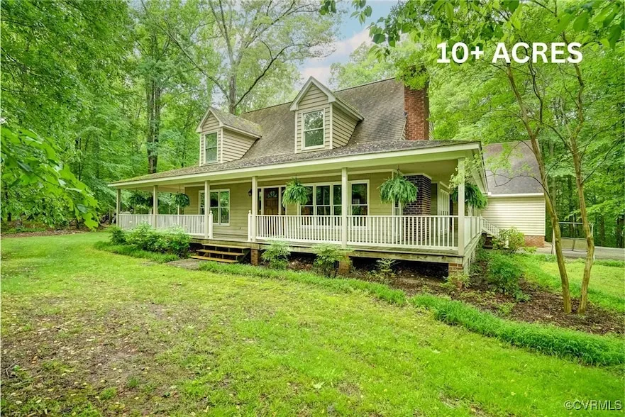 Once in a rare while you come across the ONE. This rustic Cape Cod is loaded with country charm and was carefully crafted by its current owners. Upon entry, take notice of the open concept family room with expansive vaulted ceilings, hardwood floors and a full brick wood burning fireplace. This area connects nicely with a generously sized kitchen that offers stained oak cabinets featuring an island w/granite countertops. There are two guest rooms, a full bath and laundry/utility room to finish out the first level. The 2nd level offers a guest room, a huge bonus room over the garage and of course the Primary Suite w/attached ensuite and generous closet space. The exterior offers 10 private, wooded acres, an attached oversized 2-car garage w/raised ceilings, a FULL WRAP 8' deep country porch all the way around and a partial paved driveway up near the home. This one is a rare find so make plans to see it today.