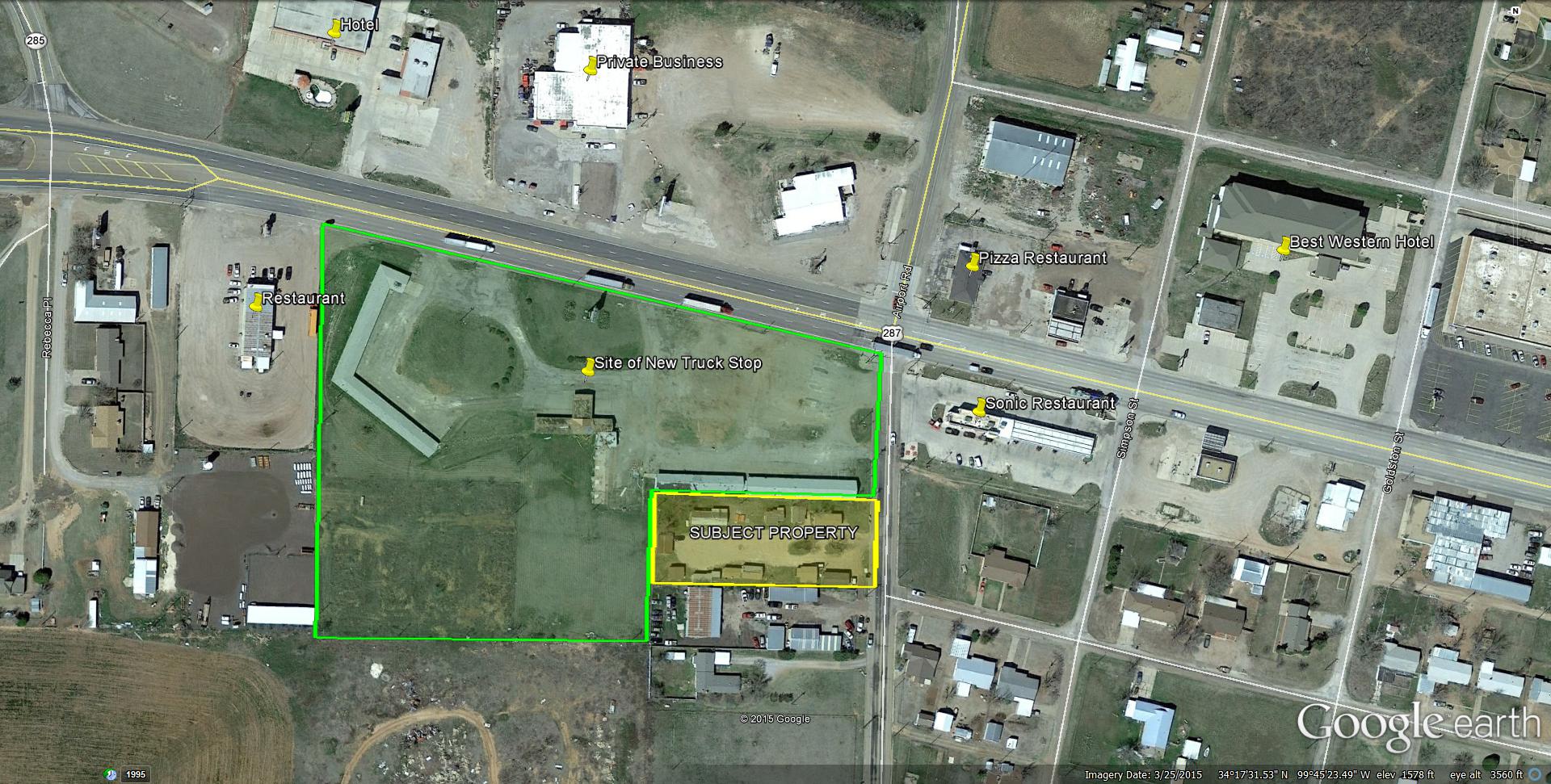 Commercial lot on Airport Rd. in Quanah, Texas. This lot has access to all utilities and is joined on two sides by the new Loves Truck Stop (currently under construction). The lot is located just off of Highway 287 at the blinking yellow light, with good sign visibility and commercial potential. Nearby businesses include the new mega Loves Truck Stop, which will include two restaurants, another smaller gas station, Best Western hotel, Sonic, and two other local restaurants. Lots of potential here. There are some older buildings that need to be cleared on the lot to make way for new construction.