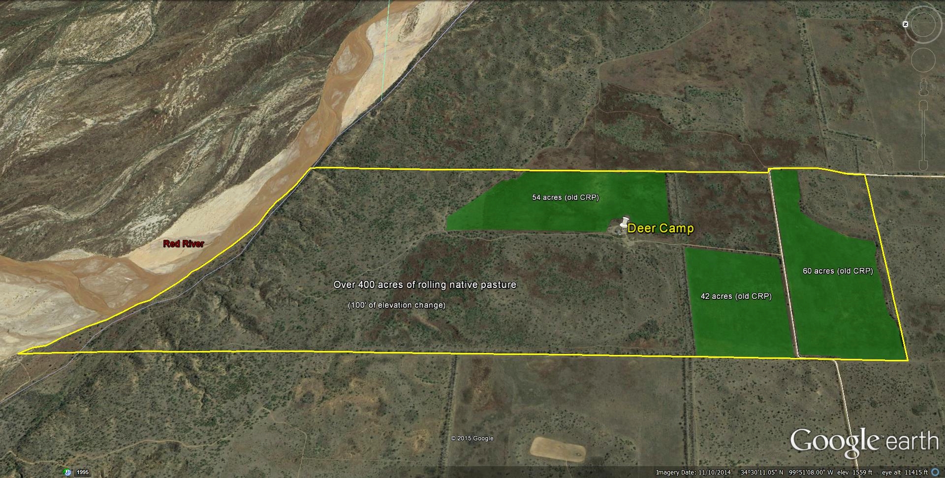 This stream of the Red River is the Prairie Dog Town Fork (the same that carved out Palo Duro Canyon), and it runs water most of the year in a small stream. The sandy river bed is covered in deer tracks and acts as a magnet for game in this area of the county. It also allows for additional recreational activities, such as fishing, four-wheeling, camping out, etc.