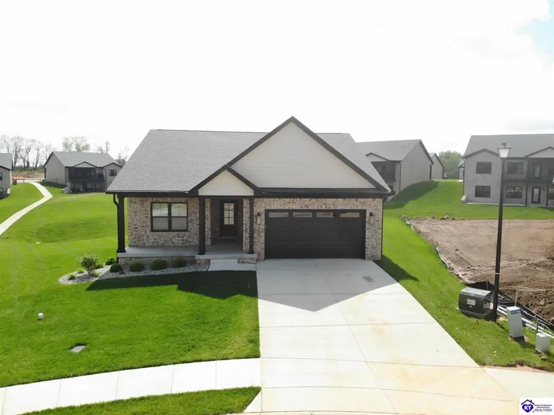 This stunning all-brick 3-bedroom, 3-bath ranch offers the perfect blend of modern style and everyday low maintenance living. Built in 2023, the home features an open-concept layout, a fully finished walkout basement, and beautiful views of the neighborhood lake right from your covered deck and patio. Enjoy ample living areas, a stylish kitchen with stainless appliances and large pantry, and spacious bedrooms, each with easy access to well-appointed bathrooms. Located just minutes from shopping, dining, and everyday conveniences, this home combines peaceful lakeside living with unbeatable accessibility.