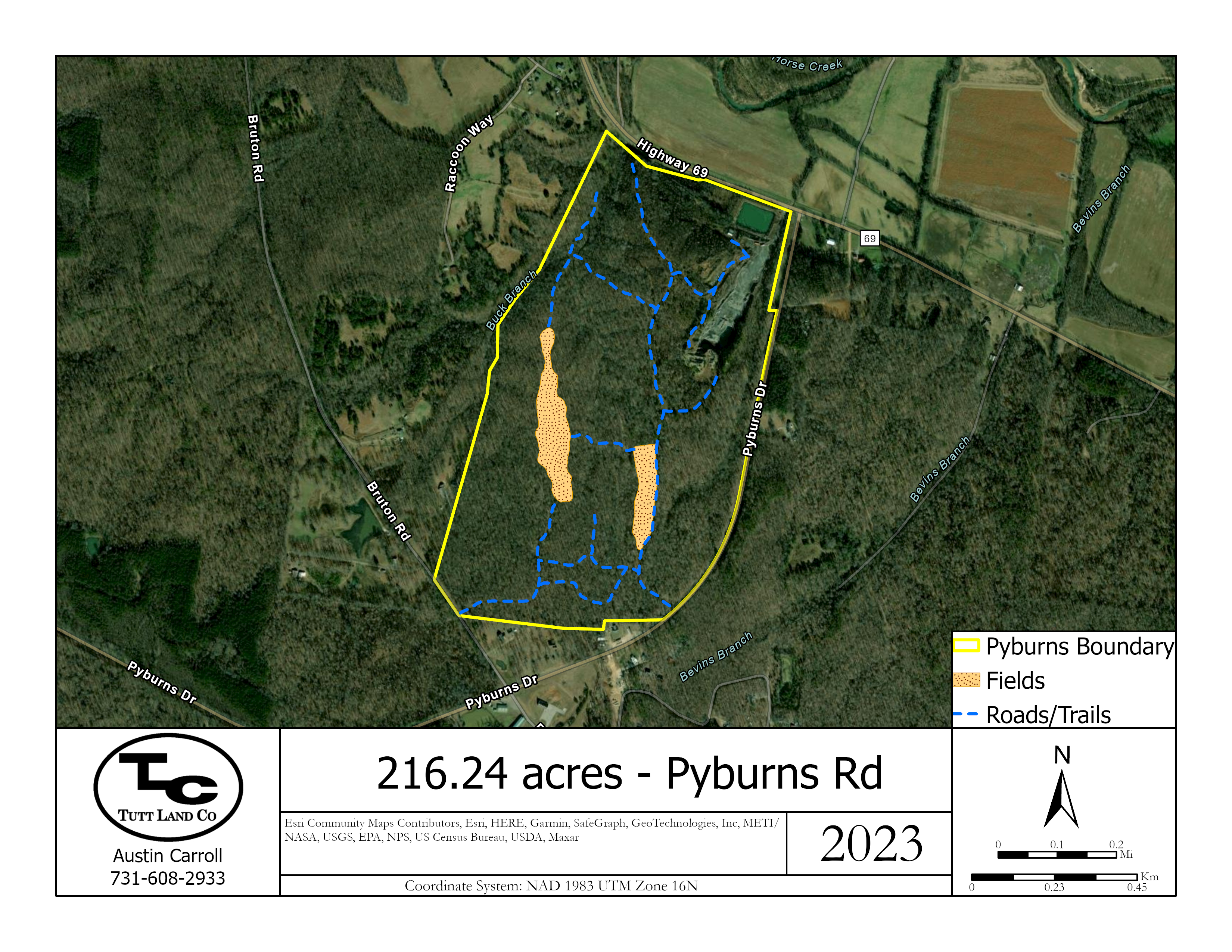 The Pyburns tract contains 216.24 surveyed acres and is located about 10 miles south of Savannah, TN. It has frontage along Highway 69, Pyburns Rd, and Bruton Rd.