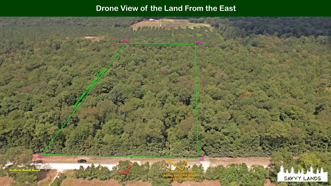 5.) Turn Northwest (Left) onto Outlaw Bend Road and continue for approximately 0.75 miles until you reach the Southeast corner of the property on the West (Left) side of Outlaw Bend Road.