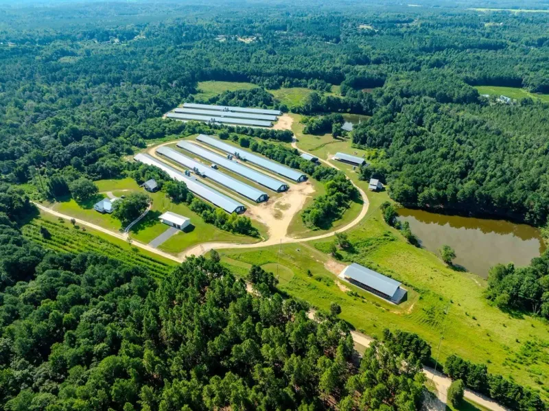 - Additional Features: 2 large litter sheds (42x100 ft) built in 2022, 6-bay composter, three wells, county water, a 133 kW generator, and a nice pond.