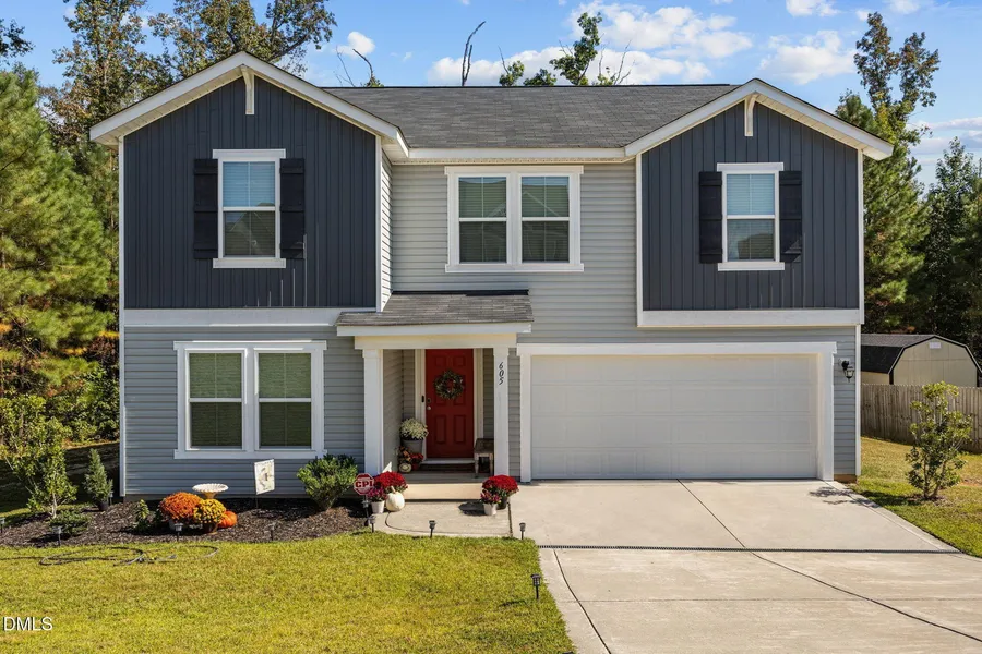 **Up to $1750 in Closing Cost Credit w/Preferred Lender** 605 New Castle Lane - a home that blends elegance, comfort, and functionality in one beautiful package! This 5-bedroom plus loft, 2.5-bath home offers sophisticated living with a modern touch, designed to impress at every turn. Step inside to find thoughtfully styled living spaces, highlighted by custom wall shelving (conveys), chic electric fireplaces(convey), and a stylish open-concept layout. The gourmet kitchen is a chef's dream, complete with high-end touches and plenty of room for entertaining. A first-floor bedroom provides the perfect option for guests, multi-generational living, or a private office. Upstairs, you'll find generously sized bedrooms and a versatile loft that can serve as a second living area, playroom, or workspace. Every detail in this home has been carefully curated, setting it apart with polished style and finishes. Beyond the home itself, the community enhances your lifestyle with a gorgeous pond, walking trail, and playground, offering spaces to relax, recharge, and connect. Conveniently located near shopping, dining, Fort Bragg, and commuter routes, this home offers both luxury and practicality at a great price. Don't miss the chance to own this stunning property that truly stands out from the rest!