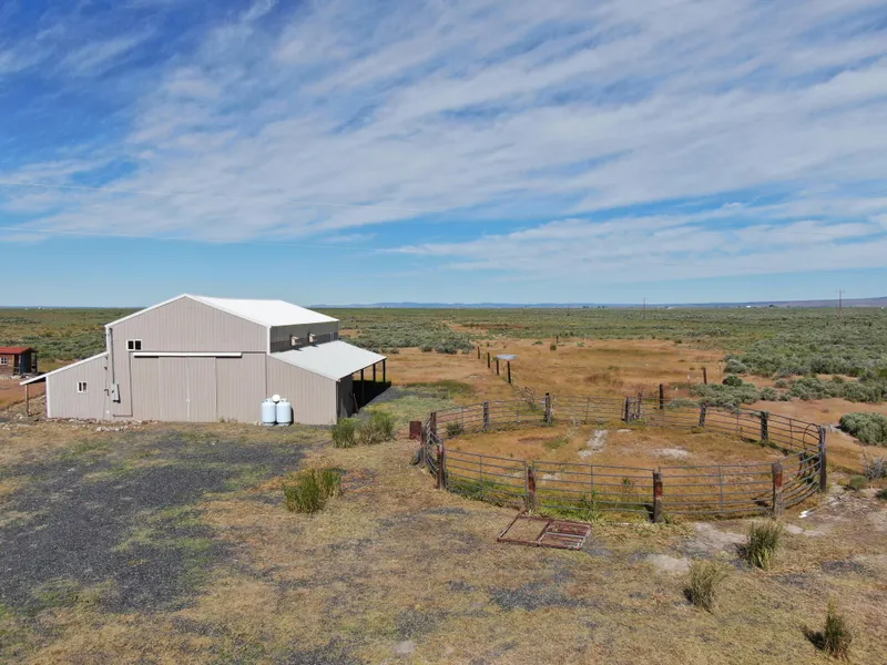 Located in Eastern Oregon, this 160 acre parcel lies of Penny Rd roughly 25 miles east of Burns. This ground has been seeded with dryland wheat and has previously been leased out of cattle. The 2,016 sq. ft. shop has a full living quarter located inside that includes a mud room with a washer & dryer, a full kitchen and a bath that has a shower. The bedroom has carpet flooring with an armor and is the entrance to an upstairs room. The rest of the shop has gravel floors, a walk in freezer and partial lean-to. To complete the property there are various sheds and corals.