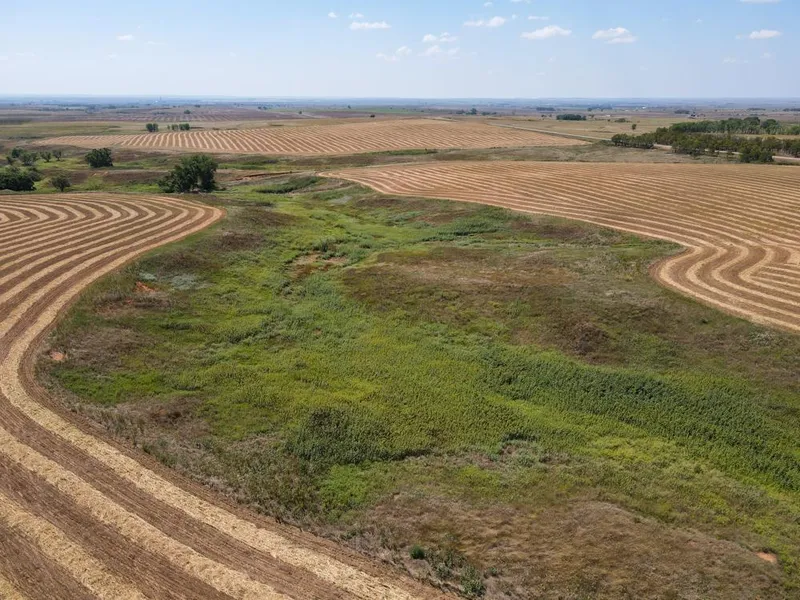 The remaining 60 or so acres are native pasture. There is some elevation change on the east side due to a grassy draw that provides a travel corridor and bedding area for wildlife. The tillable crop ground is the ultimate food plot. There are a few bottom ground cottonwoods that make for a good ambush point for the huge whitetai...