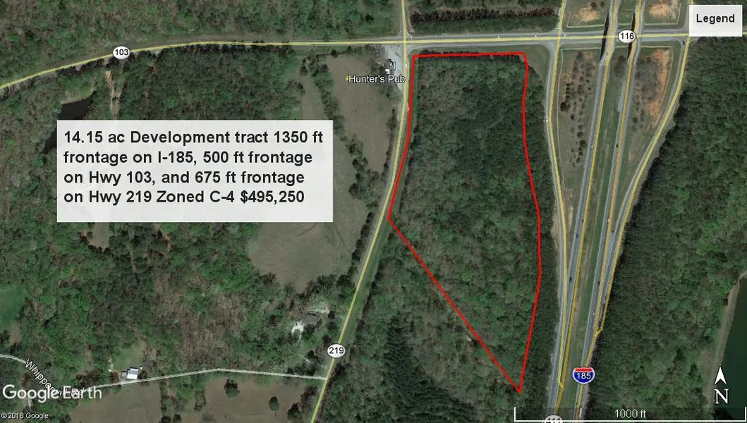 Commercial development opportunity next door to the infamous Hunters Pub just 8 miles north of Columbus and 20 miles south of LaGrange. The property has 1350 ft frontage on I-185, 500ft rd front on Hwy 103, 700 ft rd front on Hwy 219. Good topography on the majority of the property zoned C-4 Commercial. Seller will consider subdividing property.