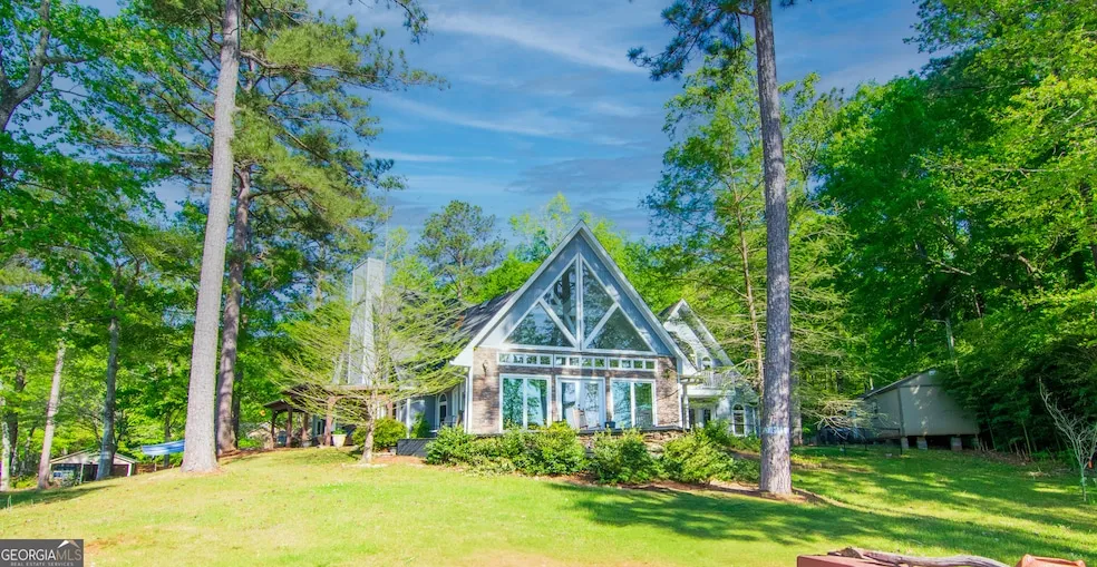 Imagine beginning each day with the sun rising over the eastern horizon of Lake Harding-savoring your morning coffee from the comfort of bed with a front-row seat to nature's show. Afternoons bring endless lake adventures, from boating and jet skiing to kayaking and paddleboarding. As the day winds down, gather around the fire pit to watch the sunset paint the sky in breathtaking colors reflected over the water. This is lake life at its finest-and this remarkable home is your opportunity to make it your everyday reality. Boasting 4 bedrooms, 4 bathrooms, and 5,175 square feet of thoughtfully designed living space, this architectural masterpiece is unlike anything else on Lake Harding. Stunning exposed beams, soaring vaulted ceilings, a unique floor plan, and walls of windows create an atmosphere of light, warmth, and connection to the water from nearly every room. Fantastic gourmet kitchen with view of lake & great room. Large master bedroom with lake views. Master bathroom features, whirl pool tub, tile shower & walk in his & hers closet's. Set on a private 1.25-acre point lot with an impressive 480 feet of waterfront, the home offers an unmatched sense of tranquility and privacy. Enjoy multiple decks perfect for entertaining, a secluded dock, a boathouse, a detached garage, and a carport pavilion-designed for year-round enjoyment and relaxation. Whether you're seeking a luxurious full-time residence or a serene weekend retreat, this one-of-a-kind property delivers the very best of lakeside living.