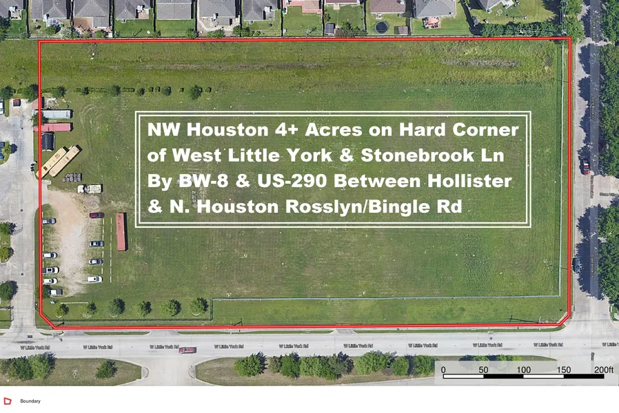 Hard Corner 4.079 Acres with ~547 feet W. Little York Road Frontage & ~300 feet Stonebrook Lane Frontage. Located between Hollister & North Houston Rosslyn/Bingle Rd Near NW Houston. West Little York Rd is a 4-lane divided road that runs East past I-45 & Hardy Toll Rd to I-69 10 miles away. It also runs 15 miles to the West with future development connecting it to Grand Pkwy 99. One of the 2 driveway cuts lines up with the median cut on W. Little York. Property is 3.5 miles East of BW 8/US290, 5.8 miles West of 610, 1.7 miles North of US290/Hollister, 5.8 miles West of I-45 & 13.5 miles NW of Downtown Houston. Property is in Houston City Limits with All City Utilities, 3-Phase Power & No Zoning, but is subject to NW Place Business Center Restrictions. Ask Agent for Details. Property is cleared, level, fenced with onsite detention in place & ready for new development. Property is comprise...
