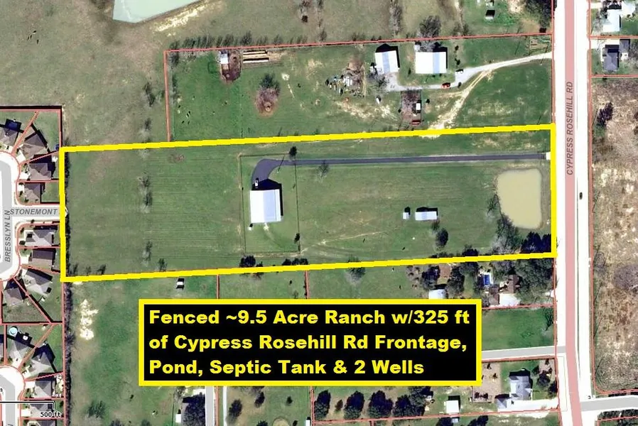 ~9.49 Acre Commercial Land w/325 ft of Cypress Rosehill Frontage near Hwy 6 & US-290. Property has 80x60 steel building, pond, septic tank & 2 wells. Main entrance has asphalt driveway, ranch style gate w/automatic gate opener, entry overhead & cattle guard. 2nd entrance has pipe gate, concrete & gravel driveway. Steel building has concrete floor, half bath, 1200 sf apt, 1200 sf loft w/wood decking & two 14 ft high overhead doors. Apt has tile floors, 1 bedroom, 1 full bathroom, kitchen/den & office. 0.5 Acre pond is 6 ft deep & stocked w/catfish. Make an appointment with Heidi Allbritton to see all the possibilities this prime property has to offer. Survey Available! Can be Commercial or Residential!