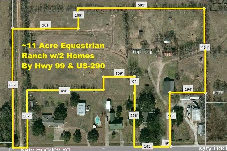 ~11 Acre Equestrian Ranch in Katy w/Two Homes & Two Separate Entrances by the Grand Parkway/HWY 99 & TX-6/US 290. 1st Home was Remodeled in 2007 and is 3219 sf Brick Single-Family Home w/4 bedrooms, 3 full bathrooms, Large Island Gourmet Kitchen, living room, formal dining room, family room/gameroom, fabulous master suite, large utility room inside house, screened-in porch and 3-car detached garage w/2 additional rooms in back. The Large Gourmet Kitchen has plenty of Granite Countertops, Wall-to-Wall Cabinets w/Built-in Desk, Wetbar, Island w/sink & attached Breakfast Table. 2nd home was built in 2011 and is ~1000 sf double-wide manufactured home on a concrete slab w/3 bedrooms, 2 full bathrooms & 2-car detached garage. Each home has its own aerobic septic system & private well. Property is cross-fenced, perfect for horses and has large hay barn w/additional storage on side, 130X375 pipe arena w/lights, 7-stall barn & 9 paddocks, 19x24 Storage Shed, Hay Barn w/Additional Storage & a Treehouse. Income potential! Minutes to US-290, I-10 & Katy Mills. Paul Rushing 232-Acre Park is located across the street and has 4 baseball fields w/lights, 2 softball fields, clubhouse, restrooms, dog park, lake boardwalk & walking trails throughout the Chain-of-Lakes 100-Acre wildlife habitat interconnected lakes. Can be multifamily, commercial or residential! Great location for single family development, farm/ranch, shopping center, business park, grocery store, mini-storage, truck parking lot, Horse/Dog Boarding/Training Facility, Animal Rescue Reserve, Church Camp/Youth Retreat, University, Animal Hospital/Clinic, Medical Hospital/Urgent Care Clinic, Retail Strip Center, Gas Station/C-Store, Drive-Thru Truck Stop, Hotel, Warehouse/Storage, Retail Center, Apartment Complex, RV Park/Campgrounds, Supermarket, etc.