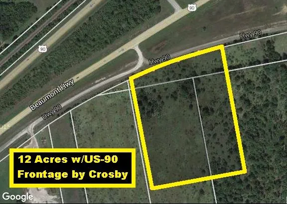~12 Acres by Crosby w/TX-90 Highway Frontage. Only 13 miles East of BW-8. Just 18 miles to I-10 & TX-146. 30 miles to Downtown Houston, Bush Airport & Lake Houston. Great location for small farm or horse facility, Single Family Acreage Subdivision, Church, Warehouse/Storage, Car Dealership, University, Strip Center, Gas Station/C-Store, Drive-Thru Truck Stop, Hotel, Hospital, Shopping Mall, Distribution Center, Retail Center, Apartments, Supermarket, RV Park/Campgrounds or Commercial Business w/Billboard. Needs Well & Septic! No City Water/Sewer! Ag Exempt!