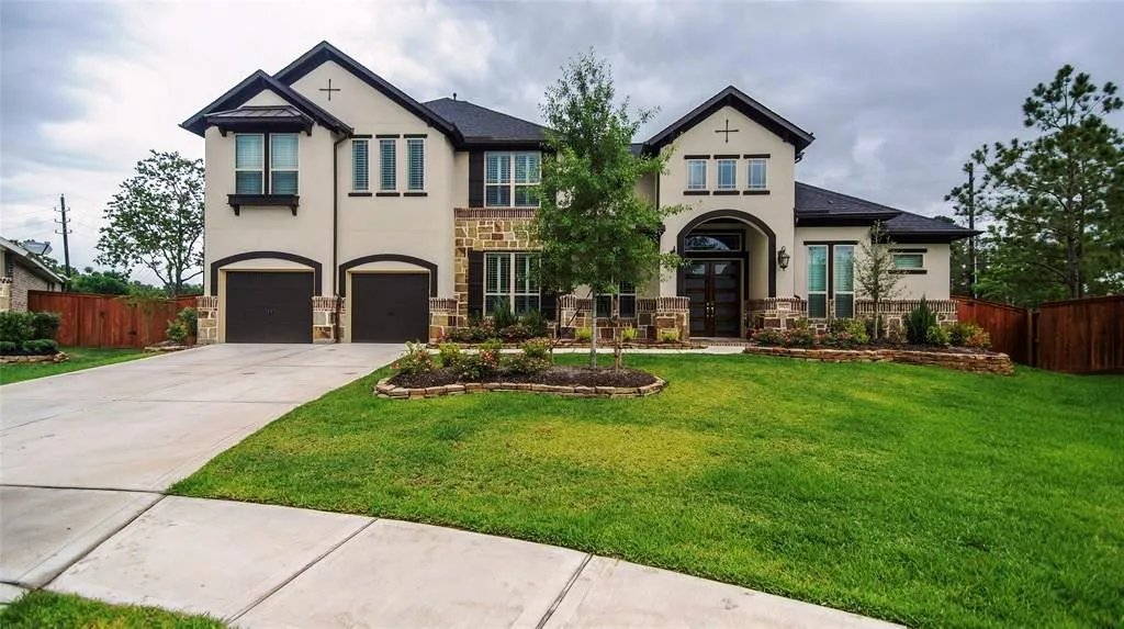 This gorgeous Trendmaker home has great curb appeal with stone and stucco detail. Once inside, be greeted by soaring ceilings adding a WOW factor!. Wood floors in select rooms add luxury. In the kitchen, enjoy stainless steel appliances with double ovens, granite counter tops, a custom backsplash, and a large island. The large island is perfect for entertaining! The Master suite has his and her closets plus double shower heads. The 2nd bedroom down is ideal for a guest suite. Upstairs, entertain in the media room and game room. All upstairs bedrooms have walk-in closest and are spacious. The 3- car tandem garage has plenty of space for all your cars and storage. Custom built-ins have been added in the Master bath closet, the study, laundry room and garage. Seller has also added a water softner. Large covered patio with a HUGE backyard that has endless possibilities. This home has so much to offer, don't pass it up!