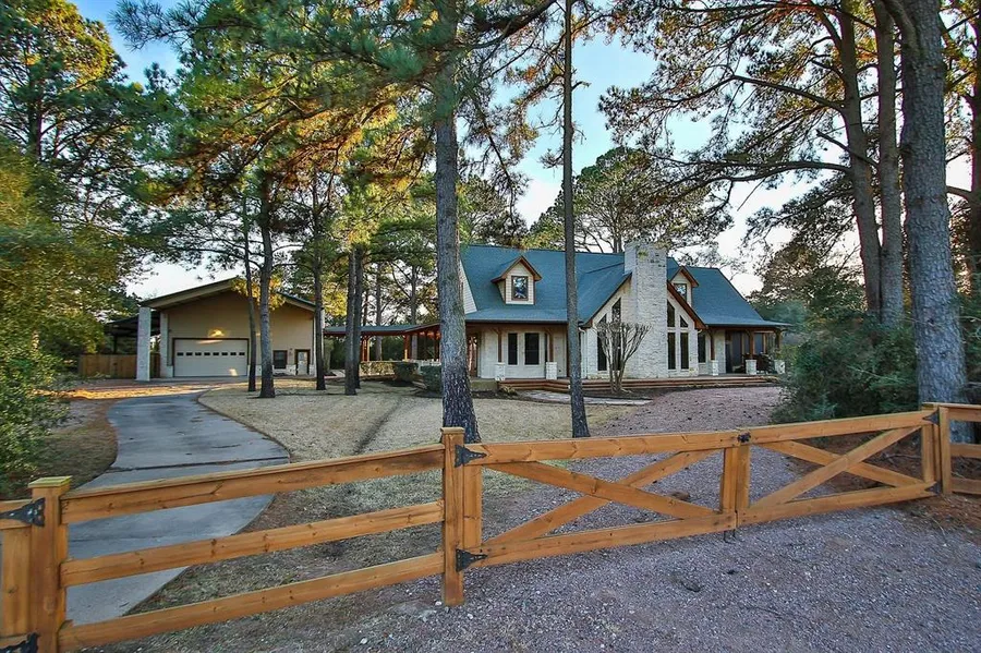 Beautiful custom built home stowed away on 3.5 unrestricted acres of partially wooded terrain. Home is located at the end of a private road; features a perfect combination of large trees, open space and thick wooded areas for complete privacy. Spend your weekends fishing from your own private pond stocked with bass. At the end of the long driveway is a huge 4 car garage featuring a completed apartment with a full bath and office space above. Inside the main house you will find high ceiling, a custom kitchen with gorgeous granite countertops overlooking the large living space centered around a huge stone fireplace. The master is located downstairs with its own bath and direct access to the covered patio. Upstairs features a large loft flanked by 2 large bedrooms both with their own full bath. This property has its own septic and well system as well as an automatic bug spray and sprinkler system. Separate septic in the back for an optional RV. NEVER FLOODED!