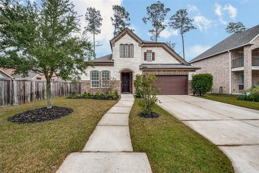 Delightful & charming sought after 1 story Meritage home in conveniently located Sawmill Ranch community!Impressive tall entry as you walk into this beautiful home.Gorgeous tray ceilings adorn entry & dining room.You will be delighted by the 8 ft doors & hardwood floors throughout most of living areas make this a rare find.Chef's dream kitchen with extra large island,SS appliances,walk in pantry,farmhouse sink,& all open to living room.Generous size primary retreat with bay window,fantastic bath with dual sinks,& 2 walk in closets. Framed mirrors in both bathrooms.Whole home water filtration system/softener,gutters front/back,all 4 sides of home are brick,epoxy garage floors.Backyard has large 20x10 covered patio.Just minutes to ExxonMobil Complex,The Woodlands,I-45,& Grand Parkway.You will love living in Sawmill Ranch with all the desired amenities it has to offer such as 2 big lakes wi...