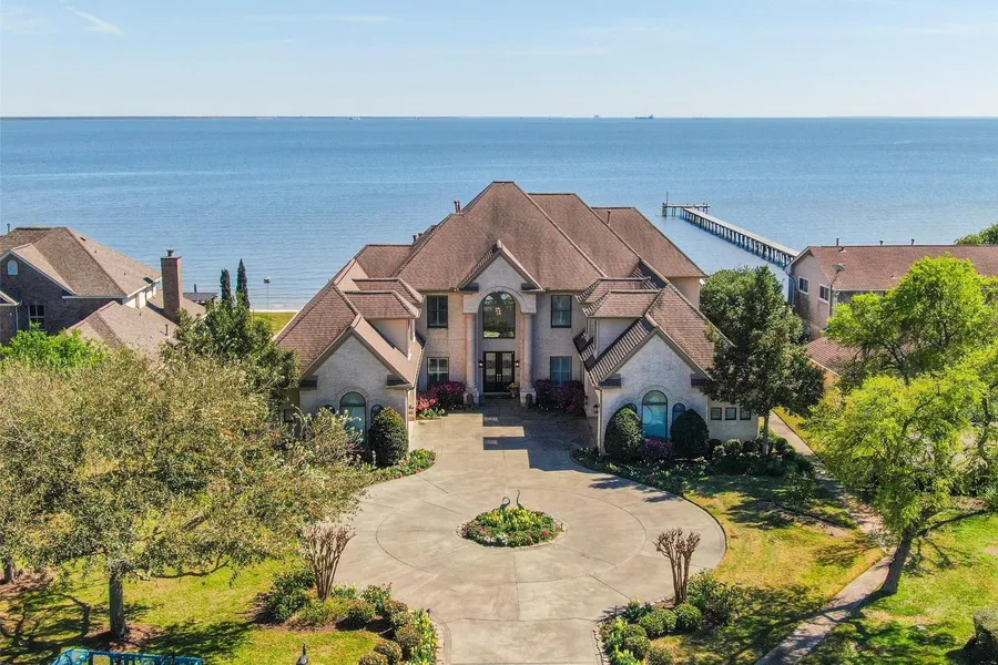 A sweeping freestanding staircase accentuates the beauty of the two story entry. Soaring living and dining ceilings are overtaken by the magazine-worthy views of the bay. Dramatic fireplace accents the living area while mirrored dining room wall unite the open floor plan. Through out the homes is, exquisite woodwork, cabinetry, and millwork. Makes this a custom home different from many. This home's unique design gives flexibility to office and live within the awe-inspiring location of Morgan's Point. If you want to feel as if you are on vacation while working from home, this is the place. Conveniently located at the entry you find an office/study with custom cabinetry, in addition there is a back office with private desk and work space for two. Primary bedroom boasts a wall of windows, fireplace and opulent bath. You will also find a secondary bedroom and full bath on the first floor, to accommodate guests. Upstairs media room has custom cabinetry and private door to the balcony.