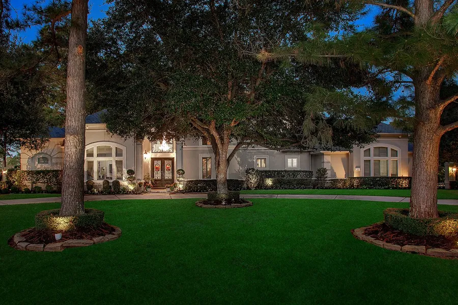 Gorgeous custom home on over an acre overlooking the 6th hole of the Gleannloch Pines Golf Course! Circular drive, oversized four car garage with epoxy floors, water softener, Plantation shutters, Hunter Douglas shades, neutral paint palette, surround sound, marble floors and amazing storage throughout. Open concept formal living areas with sky high ceilings and enormous windows featuring panoramic golf course views; convenient wet bar with wine chiller and glass front cabinetry; study with built-in desk and floor to ceiling bookshelf; island kitchen with breakfast bar, walk-in pantry, under and over cabinet lighting overlooks the breakfast nook and den with gas log fireplace; guest suite and owner's retreat down; three bedrooms, 2nd study/flex room and game room up; massive patio with adjacent entertainment area has summer kitchen, beach entry pool with slide, 2nd lap pool and golf cour...