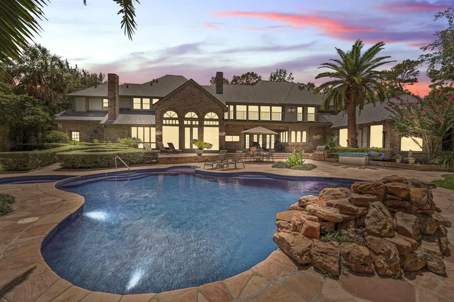 Entertainer's dream home with plenty of space for family: 6 bedrooms, 6 full & 2 half baths. Grand 2-story entry leads to 2-story LR with picture windows & French doors overlooking the waterfall pool, with wet bar pass thru to patio! DR includes accent up lighting, parquet wood floors & wine room. Library/family room offers built-in bookcases & opens to covered patio. Chef's kitchen: 8'x5' granite island, 2 Thermador gas stoves, 2 ovens, 2 sinks, 2 dishwashers, trash compactor & more. Breakfast room holds a full-sized dining table & has two built-in desks. Quaint tea/sun room features white lattice & garden ambiance. Wood paneled study at the front of the house has plenty of built-ins, parquet floors & convenient wet bar. Workout room accessed through study or primary bathroom. You'll love: custom crown molding, 5 gas fireplaces, zoned sound system, central vacuum system, backyard natural gas grill & fire features. Never Flooded!