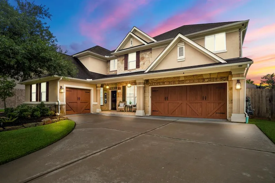 Gorgeous Stucco & brick elevation, gated Treeline community on cul-de-sac, surrounded by greenspace, fountain & lake view. 3 car garage. Front porch, foyer high ceilings & spiral wrought iron staircase, hardwoods throughout. French doors to study. Dining room crossbeam ceiling & custom chandelier. Wine fridge in Butlers pantry. Secret room under stairs, island kitchen, tall cabinetry to ceiling, granite countertops, stone backsplash, double ovens, 4-burner gas range. Living room stacked stone & gas log fireplace, w/built-ins, high ceilings & wall of windows. Primary 3/sitting area, French door to en-suite. Upstairs media rm wired for projector, built-in 7.1 surround sound. Large game room, landing area w/built in desk & 3 spacious beds up. Return stairs to kitchen. Huge covered patio w/wood beam ceiling, fans, outdoor kitchen w/ Firemagic Grill, granite c-tops. Mosquito misting system, tankless water heater, Whole House Generator! In-wall vacuum system! Floored attic space & so more!