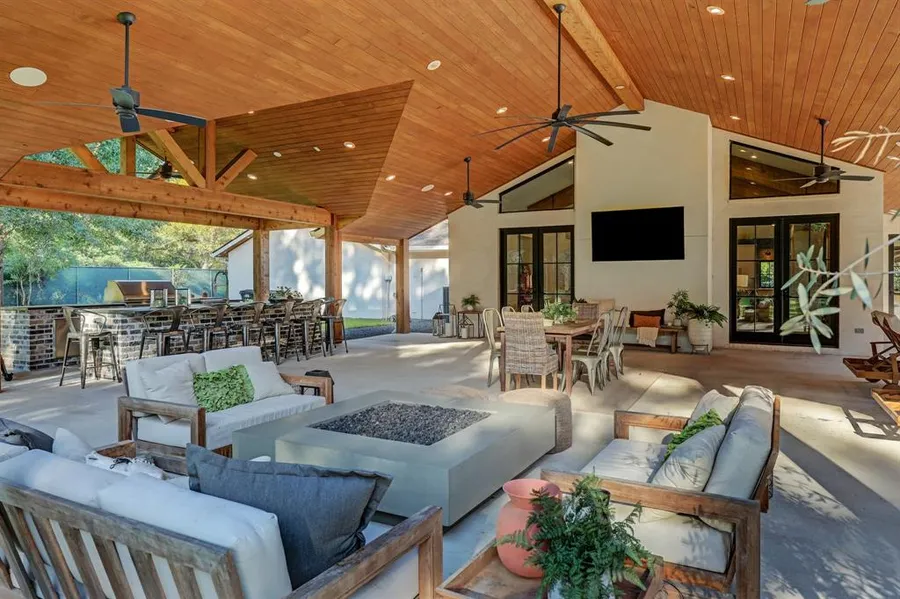 One-of-a kind property completely remodeled in the prestigious neighborhood of Rivercrest. Nestled behind a gated entrance & lush landscaping, a winding driveway provides amazing privacy to the estate, situated in a 3.4 acre park-like setting. Vaulted cathedral ceilings w wood beams, extensive millwork & moldings throughout, floor to ceiling glass windows & doors across formal living and den areas, & two fireplaces add spectacular touches of elegance. Soaring entry flows into dining room, full-service bar, & formal living. Extensive chefs kitchen w/direct access to walk-in pantry. Owners retreat w a sitting room, private office, and 2 separate primary bathrooms featuring showroom custom closets. First floor guest suite. Massive utility room with mudroom, workspace, spacious island, and space for multiple machines. UNBELIEVABLE outdoor living & custom pool perfect for entertaining year-...
