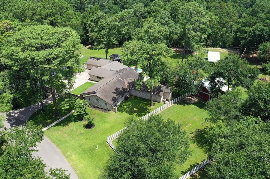 What an amazing 3.36 acre country property in Cypress! Gorgeous wooded property backs to a greenbelt. Enjoy the beauty and tranquility while still being close to everything. This property does have a history of flooding.This 1 story expansive home has 5 spacious bedrooms & 4 updated full baths. The family room is gorgeous with a beamed cathedral ceiling, a wall of built ins, a stacked stone fireplace flanked by windows with a peaceful view of the amazing property beyond. The flooring is wood look tile throughout. There are 2 primary bedrooms with private baths. The kitchen has granite counter tops and beautiful built-ins. The game room is huge. It can easily accommodate a pool table, wet bar and media areas. The game room opens to a large covered patio, sparkling pool and separate spa plus a full outdoor kitchen. The red barn with one stall adds another element of charm to this amazing property. Highly acclaimed Cy-Fair schools. This is a rare opportunity to own this fabulous property.