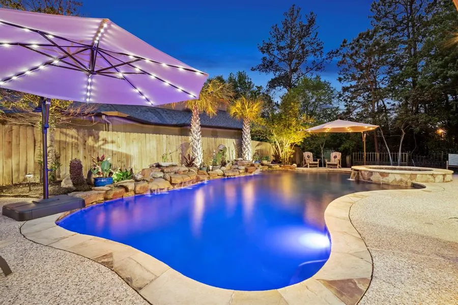 Gorgeous Gated Luxury Home in Courts at Auburn Lakes built by Cannon Custom Homes on the 13th hole of Willow Creek Golf Club. Resort style backyard oasis with pool/spa/rock waterfalls, covered patio, and lanai with gas log fireplace. Light and bright home with high ceilings, expansive windows, and abundant storage throughout. Double walnut front doors open to great room with built-ins and gas log fireplace, formal dining room, and enormous kitchen. Study has french doors that lead to the pool and has an attached full bath w/ patio access. Spacious and private master suite with walk-in closet & views of the backyard. Gourmet island kitchen has gas burner range, SS appliances, butlers pantry with wet bar and large breakfast area. Oversized staircase leads upstairs to two more bedrooms with jack-and-jill bath, plus huge game room with wet bar. Epoxy flooring in garage, full sprinkler system, lush landscaping and uplighting . Conveniently located minutes from Grand Parkway & The Woodlands.