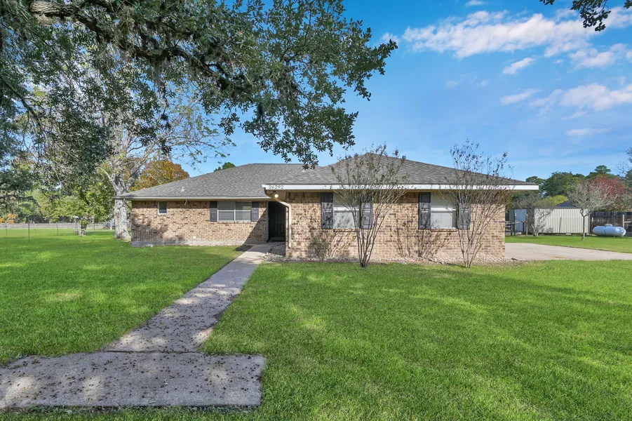 Unrestricted Property with just over an acre of land in Hockley! As you approach the property, there is a circular drive with stately hundred plus year old oak trees across the front. This brick home has three bedrooms, two full baths and a large kitchen and living area with a gas fireplace. Some fresh paint throughout, wood look laminate floors in the living/dining area and tile in the kitchen and bathrooms. The kitchen has an abundance of cabinets and counter space with stainless appliances plus a built-in desk. The primary bedroom is split from the secondary bedrooms and has a large walk-in closet. Oversized side load garage with extra parking and a storage shed in the fenced backyard. Endless opportunities in this quiet and peaceful setting with easy access to Highway 290!