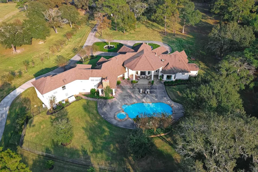 Impressive custom built estate home on 15 acres in "Oaks of Cypress". This property offers a tremendous amount of peace and tranquility surrounded by the enormous oak trees while just a short drive into Houston. Entering the home, you will see a dramatic foyer, study and formal living room with picturesque windows that overlooking the back grounds. Enormous primary suite with sitting area and access to the back yard. Off the master is an exercise room, two huge walk in closets, dual vanities and an oversized shower. (Look for the secret room) The kitchen is a chef's delight a separate prep space with pocket doors. Family gatherings can be enjoyed with the enormous space the kitchen, wine room, breakfast and family room offers. Upstairs are two bedrooms w/en-suite baths and walk in closets. The garage apartment is located just past the 4 car garage space. Lastly, the property offers a refreshing pool/spa, outdoor kitchen and fireplace, barn, horse stables and a garden house.