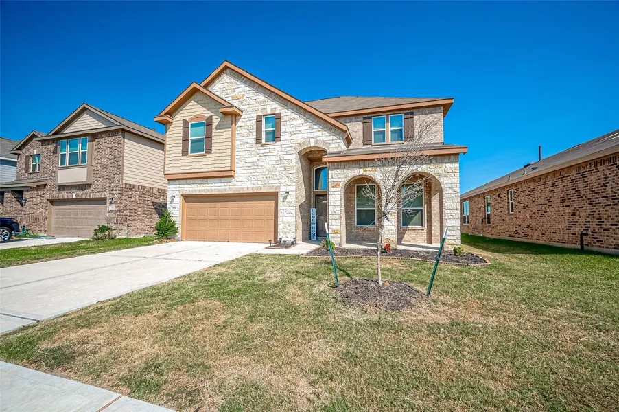 This beautiful home features a stone and brick front with a contemporary design, complemented by tile and carpet flooring on the first floor and soaring 9' high ceilings. Large windows allow natural light to fill the space, creating a bright and welcoming atmosphere. The layout offers spacious living areas, including a stunning kitchen that’s perfect for entertaining, complete with an oversized center island, granite countertops, and stainless steel appliances. The primary bedroom is located on the first floor, offering privacy and tranquility. Upstairs, you’ll find four additional bedrooms, along with two full bathrooms. The primary suite includes a luxurious en suite bath with dual vanities, a large shower, and a generous walk-in closet. A convenient half bath is also located on the first floor for guests. Enjoy your evenings and host gatherings in the backyard while enjoying the lake view.