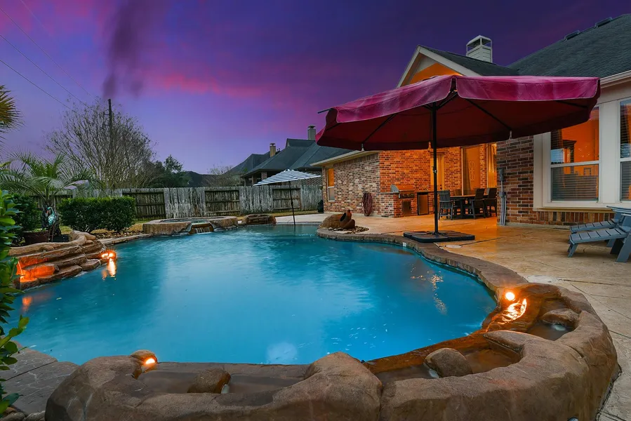 Impressive 1-story Coventry home with a pool and spa, located in the highly sought-after Eastside of the Master-Planned Community of Firethorne and zoned to award-winning Katy schools. This beautiful home offers 4 spacious bedrooms, including a Primary en-suite, a Privacy Split Floor Plan, a Junior en-suite, and 2 guest rooms, along with 3 full and 1 half baths. The home features a game/media room, living room, formal dining room, breakfast room, wine grotto, private home office, mud room and a 3-car garage. Designed with an open-concept layout, the home showcases dream kitchen showcases two large islands facing the living room and three dining areas, offering views of the backyard oasis. This outdoor space includes a large covered patio with an outdoor kitchen, a side patio, a heated pool, and a spa—perfect for relaxing or entertaining. The home also features a whole-home 26kW generator, water softener and an RO system. Schedule a viewing today to experience this exceptional home!